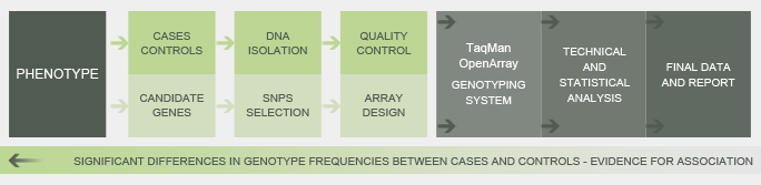 Using our TaqMan OpenArray Genotyping System, an association study was carried out by allelic discrimination of 741 SNPs within 51 candidate genes in 266 DNA samples from two groups of subjects with opposite phenotypic traits.